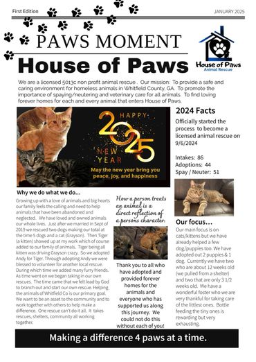 To promote the importance of spaying/neutering and veterinary care for all animals. To find loving forever homes for each and every animal that enters House of Paws.